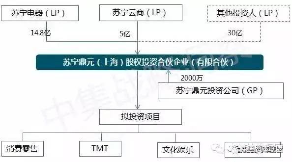 基金拟募集规模50亿元,首期20亿元,由苏宁电器和苏宁云商各认购14.8亿元和5亿元,GP苏宁鼎元投资认缴2000万。后续将由基金的普通合伙人根据基金发展情况和潜在的项目投资进展向外部投资者募集资金,也可由公司在履行相应的审批程序后对该基金进行增资或者参与后续子基金的募集。外部投资人参与的方式可以是直接对该基金进行增资也可以通过组建子基金的方式参与。
