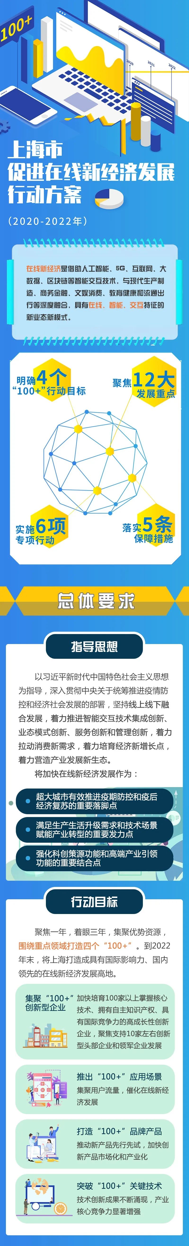 在市疫情防控工作领导小组新闻发布会上,市经信委发布《上海市促进在线新经济发展行动方案(2020-2022年)》。方案明确:集聚“100+”创新型企业、推出“100+”应用场景、打造“100+”品牌产品、突破“100+”关键技术等行动目标;聚焦无人工厂、工业互联网、在线医疗等12大发展重点;实施智能交互核心技术攻关行动、新型基础设施支撑行动等6项专项行动;落实加大统筹协调、包容审慎监管、强化公共服务等5条保障措施。详情↓